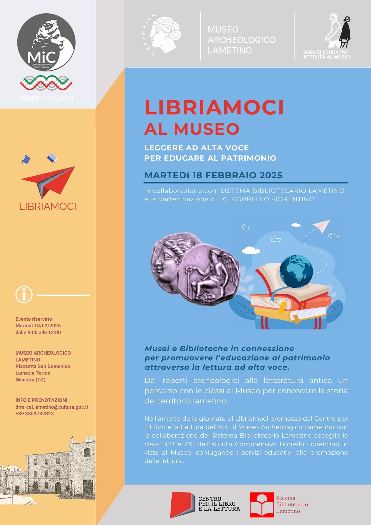 Un’attività in sinergia con il Sistema Bibliotecario Lametino, Nati Per Leggere e con le volontarie che si svolgerà nella settimana dal 17 al 22 febbraio all’interno dell'iniziativa di promozione della lettura Libriamoci promossa dal Centro per il Libro e la Lettura del MIC https://libriamoci.cepell.it/II/