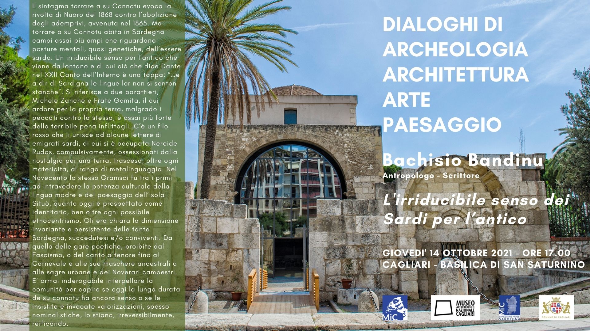 Giovedì 14 ottobre alle ore 17:00 presso la Basilica di San Saturnino si terrà il secondo incontro dei “Dialoghi di archeologia, architettura, arte e paesaggio” organizzati dal Museo Archeologico Nazionale di Cagliari.