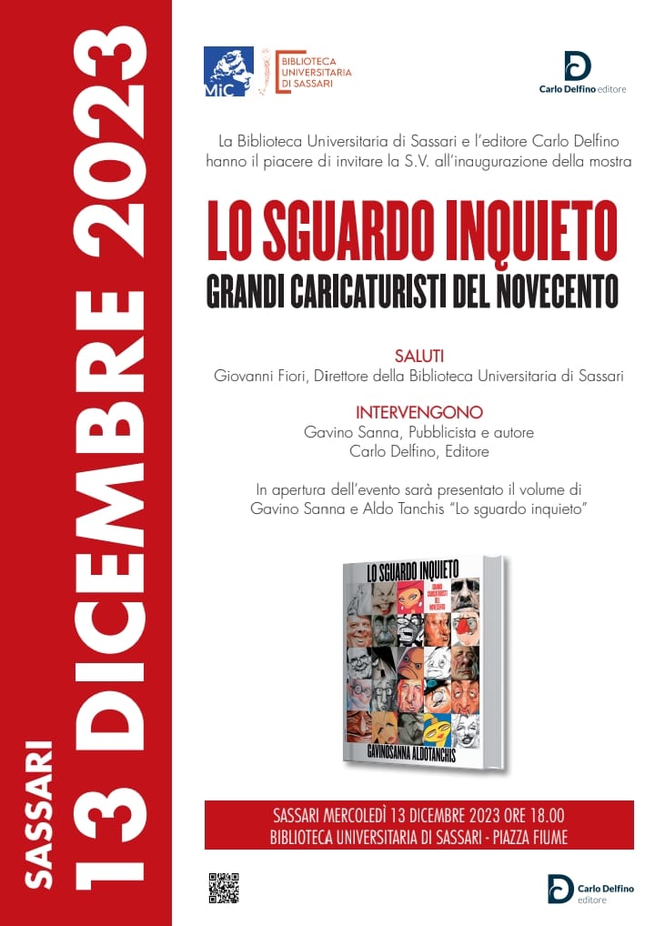 Mercoledì 13 dicembre ore 18.00, si inaugura la mostra "Lo sguardo inquieto" tratta dall'omonimo libro curato dal pubblicitario Gavino Sanna e Aldo Tanchis, edito da Carlo Delfino. All'interno della serata è prevista anche la presentazione del volume della Delfino editore, che vedrà la presenza e l’intervento del curatore Gavino Sanna, del direttore Giovanni Fiori e di Carlo Delfino.