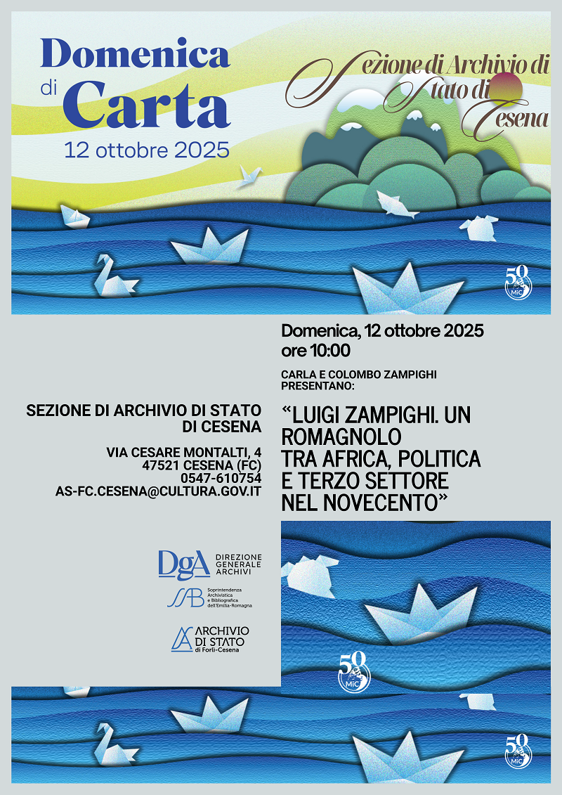 In occasione della Domenica di Carta, il 12 ottobre 2025 alle ore 10, presso la Sezione di Cesena si terrà l’evento Luigi Zampighi. Un romagnolo tra Africa, politica e Terzo settore nel Novecento. L’incontro, curato dai discendenti Carla e Colombo Zampighi, trae origine dal recente deposito in Sezione delle carte di Luigi, forlivese, dottore commercialista e figura apicale dell’Ente di colonizzazione Romagna d’Etiopia, che, dopo la Seconda Guerra Mondiale e la liquidazione di quell’organismo, trovò la sua strada, nell’Italia ormai repubblicana, nell’impegno per la collettività, coordinando pionieristiche iniziative per le classi operaie all’interno degli ambienti socialdemocratici e partecipando attivamente all’istituzione dell’attuale Associazione nazionale di famiglie e persone con disabilità intellettive e disturbi del neurosviluppo (ANFFAS).