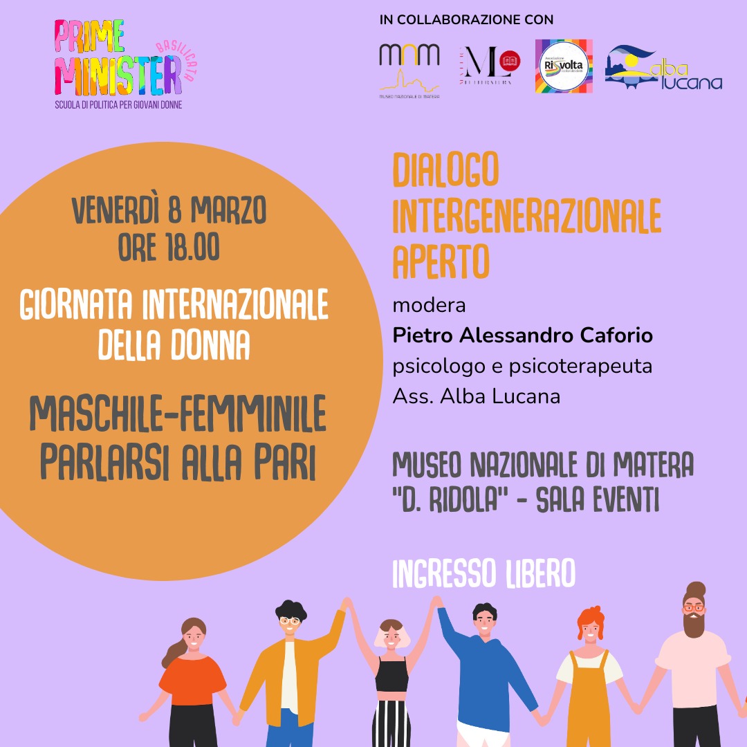 Alle ore 18:00, inoltre, presso il Museo Archeologico Nazionale Domenico Ridola vi aspettiamo per “Maschile-Femminile parlarsi alla pari” dialogo intergenerazionale aperto organizzato in collaborazione con Prime Minister Basilicata.