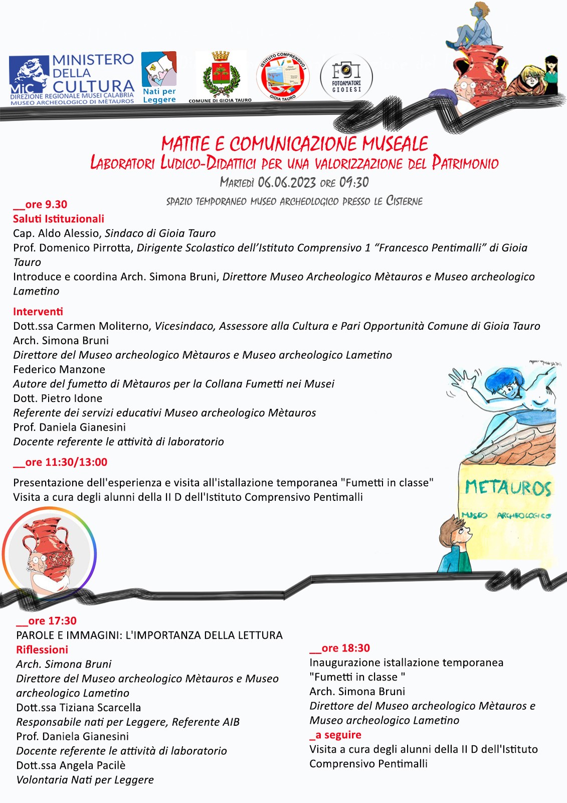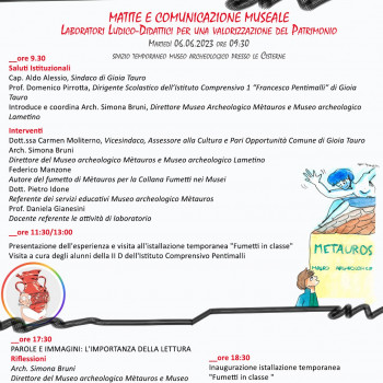 La mostra verrà presentata presso Palazzo Le Cisterne, nel corso di un evento dal titolo “Il Fumetto di Mètauros e i Laboratori Ludico-Didattici: scuole, valorizzazione e divulgazione del patrimonio”.
