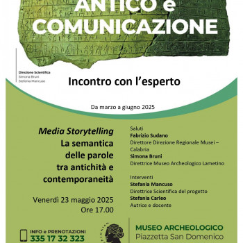 Ospite dell’incontro Stefania Carleo, studiosa della comunicazione dell’antico, docente e autrice, professionista della 'content creation' per la cultura. Interverranno, inoltre, Fabrizio Sudano, direttore della Direzione Regionale Musei Nazionali Calabria, Simona Bruni, direttrice Museo archeologico lametino, e Stefania Mancuso, direttrice scientifica del progetto.
