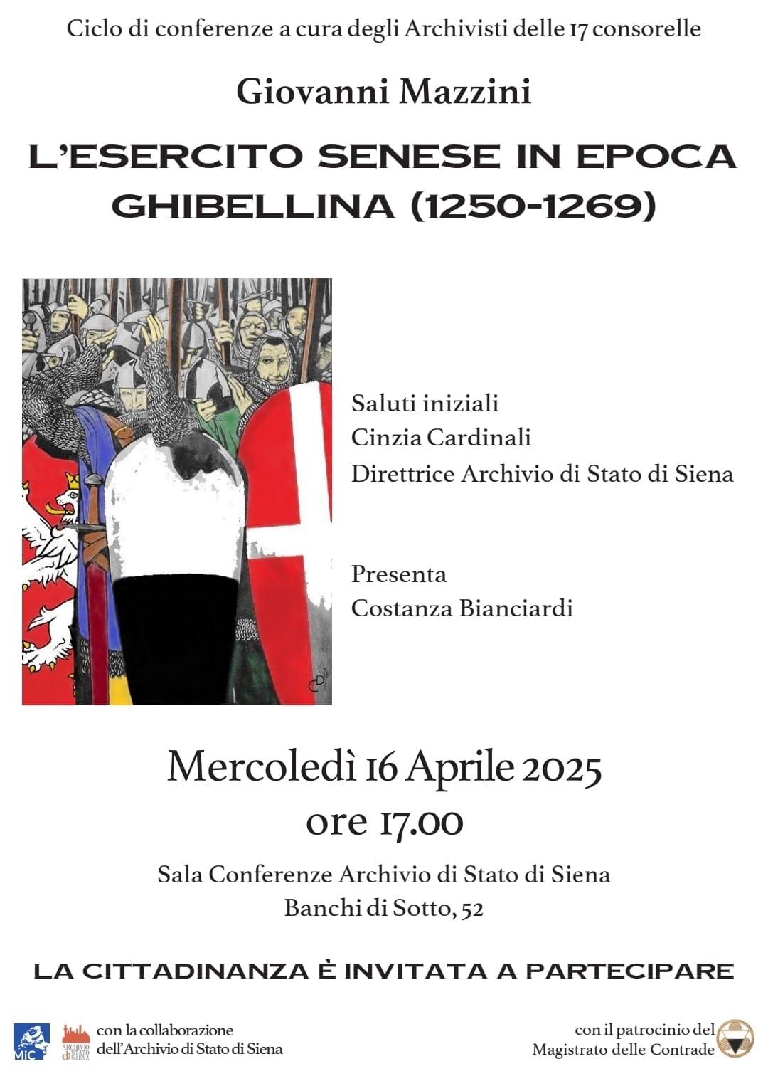 La conferenza sarà tenuta da Giovanni Mazzini, storico e archivista, collaboratore del nostro Archivio di Stato, e avrà per titolo “L’esercito senese in epoca ghibellina (1250-1269)”. Il tema affrontato nell’incontro sarà dunque quello dell’organizzazione militare del Comune di Siena, descritta nel periodo nevralgico del regime filo svevo, quando Siena dovette affrontare tre guerre contro Firenze, tra cui quella segnata dall’epico scontro di Montaperti.