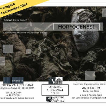 Lo storico Salone Borromini della Biblioteca Vallicelliana di Roma ospita, fino al 4 settembre 2024, la mostra MORFOGENESI (la materia organica come esperienza artistica) di Tiziana Cera Rosco, l’unica artista al mondo ad aver risieduto per un anno all’interno di un Orto Botanico.