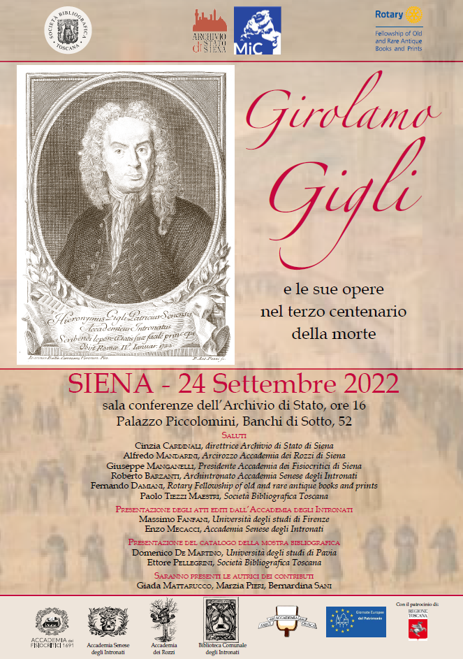Sabato 24 settembre (ore 16,00) Massimo Fanfani (UNIFI) ed Enzo Mecacci presentano gli atti degli incontri organizzati dalle Accademie senesi Girolamo Gigli, accademico, linguista, drammaturgo, a cura di Enzo Mecacci (Siena, Accademia Senese degli Intronati, 2022) e a seguire Domenico De Martino (UNIPV) ed Ettore Pellegrini presentano il catalogo della mostra bibliografica Girolamo Gigli e le sue opere nel terzo centenario della morte (Montepulciano, Società Bibliografica Toscana, 2022), che sarà visitabile a conclusione dell’incontro.