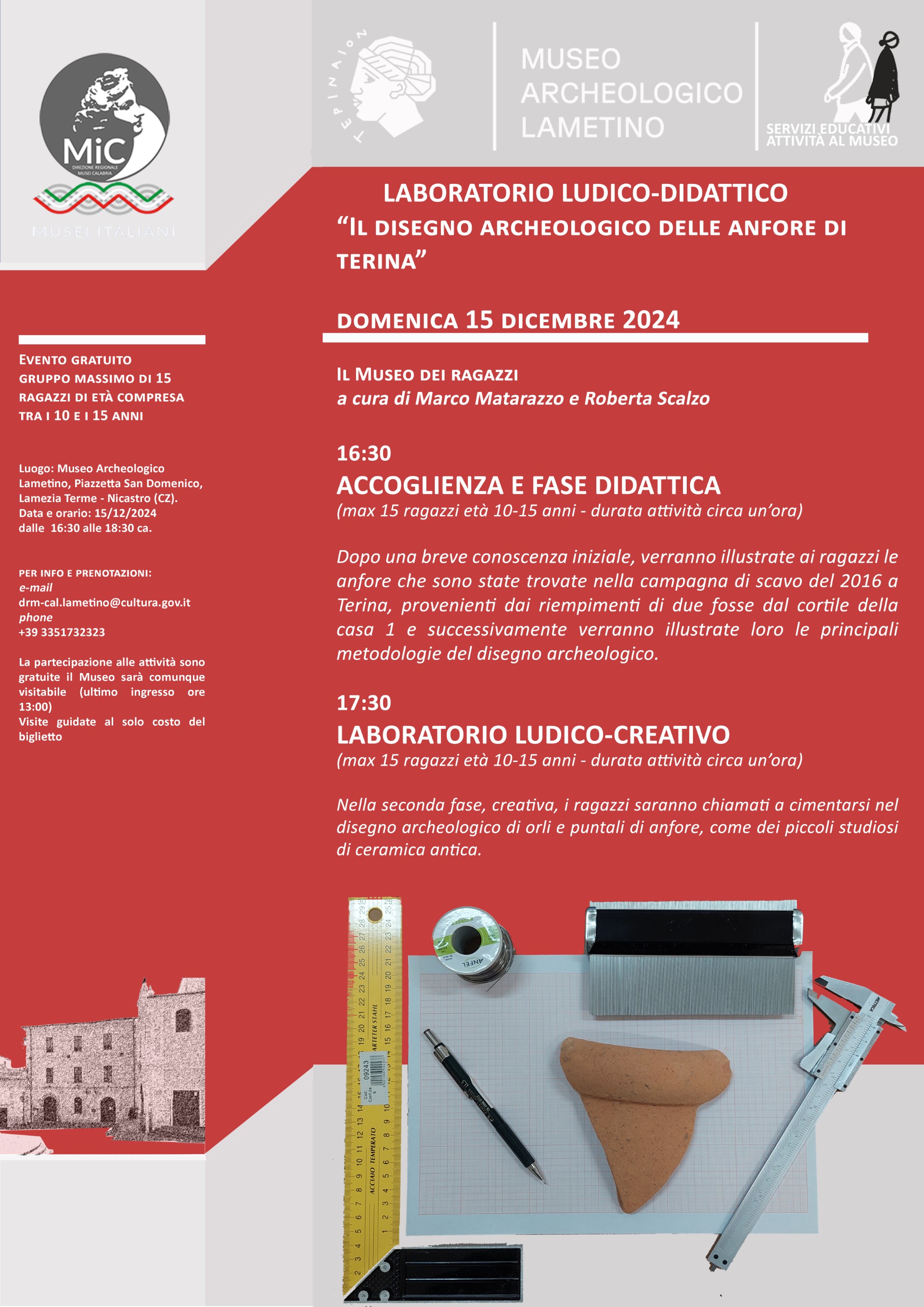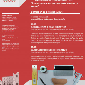 Domenica 15 dicembre, nell'ambito della corposa programmazione natalizia del Museo, un nuovo laboratorio ludico-didattico dal titolo “Il disegno archeologico delle anfore di Terina”. Due le fasi: