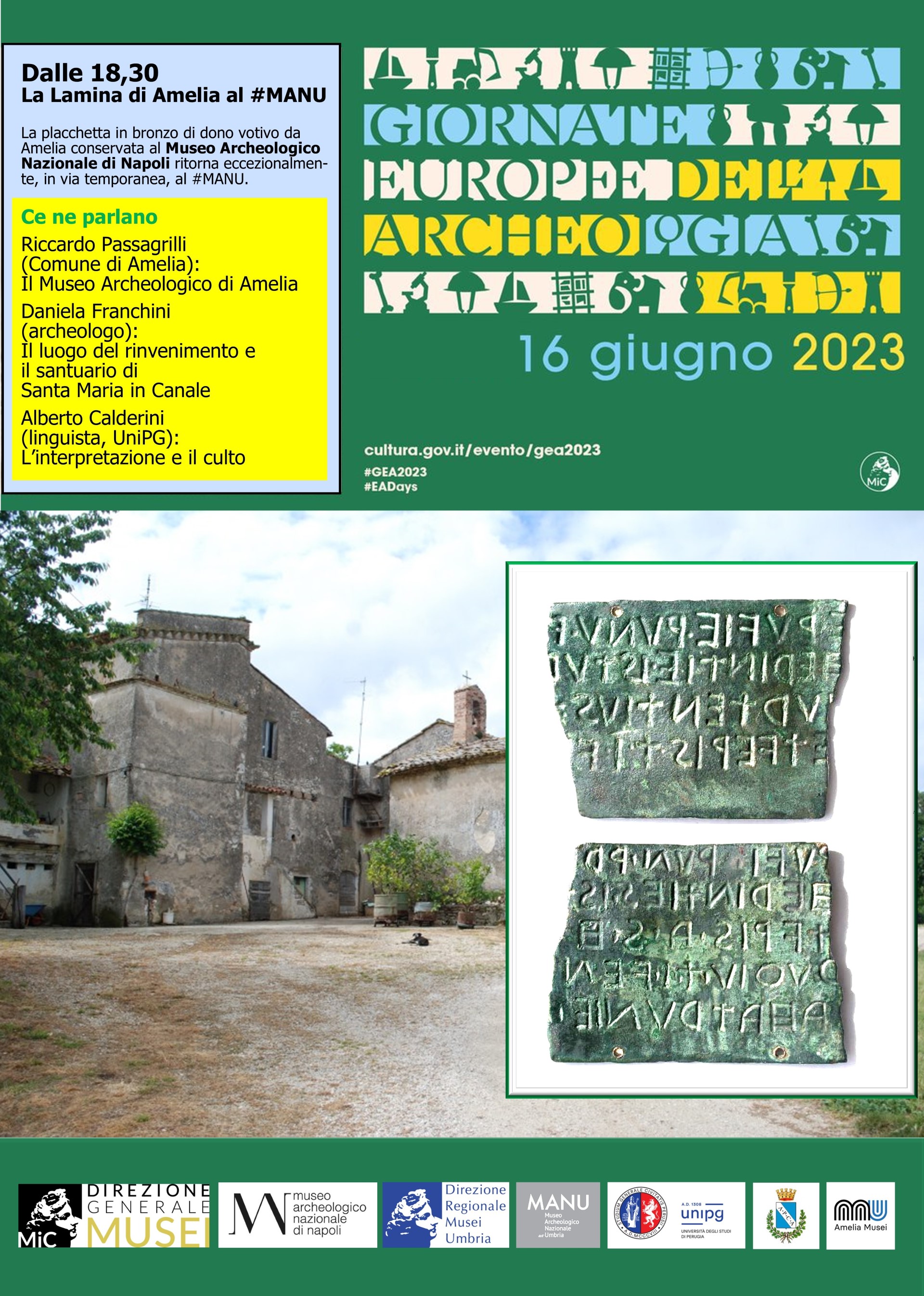 Grazie alla stretta e proficua collaborazione con il Museo Archeologico Nazionale di Napoli, l’Università degli Studi di Perugia, il Comune di Amelia e il suo Museo civico, da venerdì 16 giugno al MANU, Salone Umbri ed Etruschi, la Lamina di Amelia è esposta temporaneamente presso il Salone Umbri ed Etruschi del Museo Archeologico Nazionale dell'Umbria.