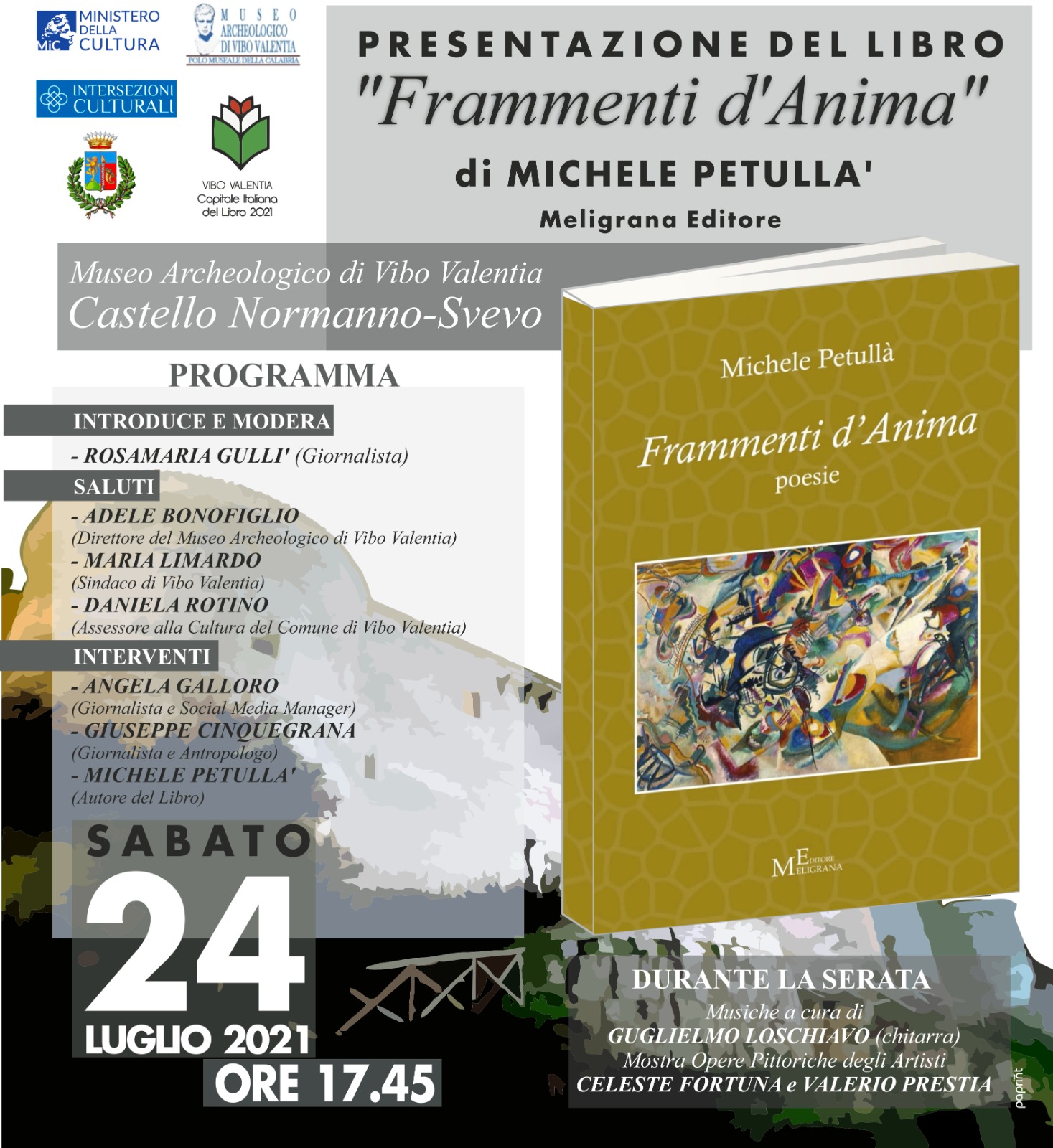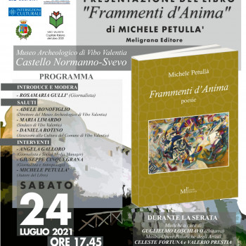 Sabato 24 luglio 2021 alle ore 17.45, a Vibo Valentia, presso il Museo archeologico nazionale “Vito Capialbi”, lo scrittore Michele Petullà presenterà il libro di poesie “Frammenti d’Anima”.