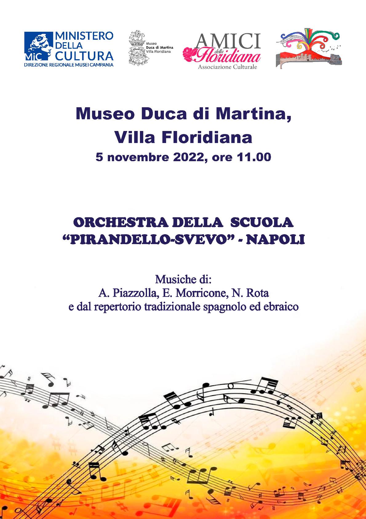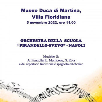 Sabato 5 novembre 2022, alle 11.00, il Museo Duca di Martina – Villa Floridiana, in collaborazione con l’Associazione Culturale “Amici della Floridiana”, ha il piacere di presentare “Musica in Floridiana”, concerto dell’Orchestra della Scuola “Pirandello - Svevo” di Napoli, già in programma per l’ultima edizione delle Giornate Europee del Patrimonio e che era stato rimandato per motivi legati al maltempo.