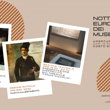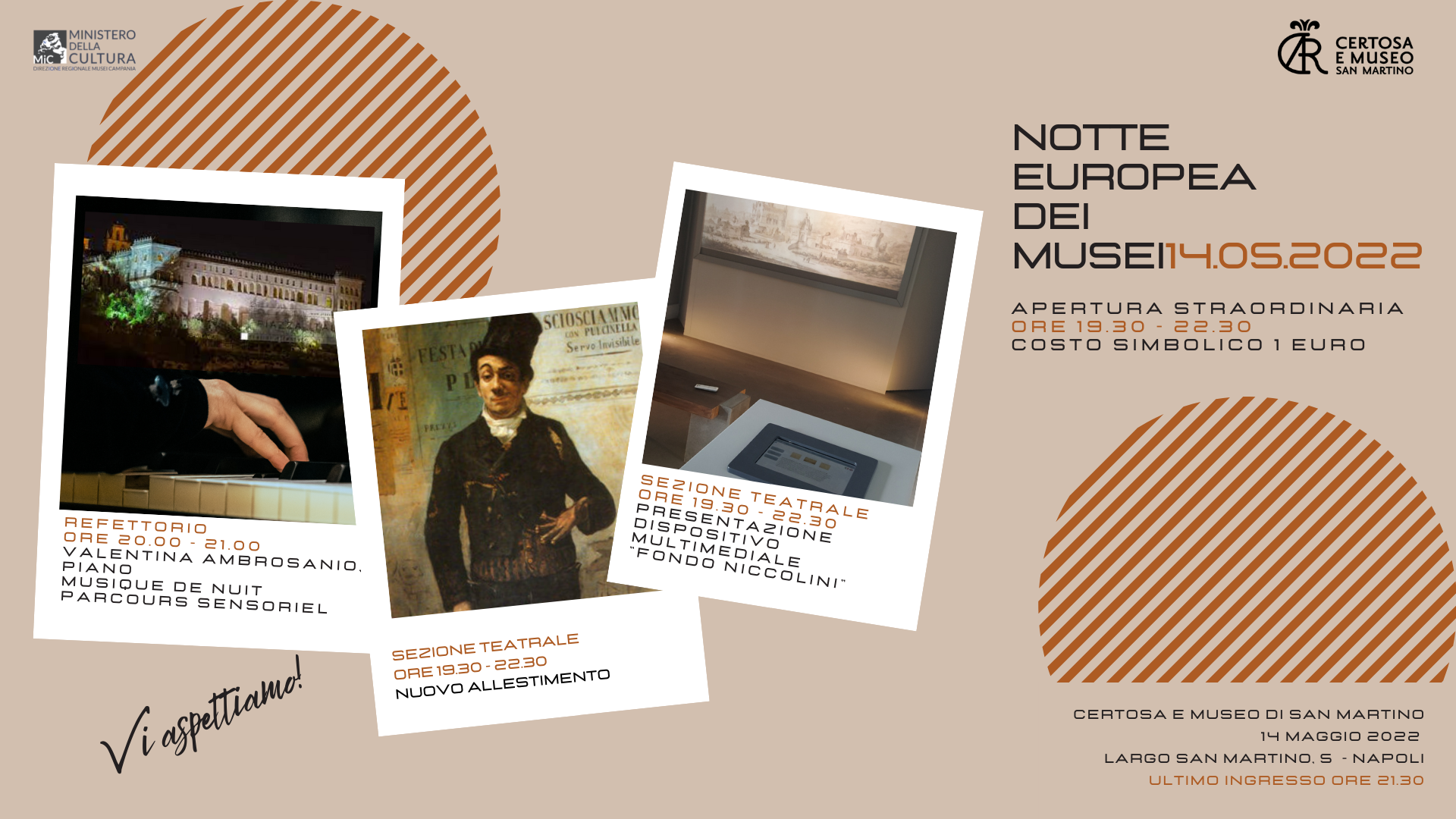Sabato 14 maggio 2022, in occasione della Notte dei musei la Certosa e Museo di San Martino effettuerà un’apertura serale straordinaria dalle ore 19.30 alle 22.30 (ultimo ingresso ore 21.30). Sarà possibile visitare la Chiesa e gli ambienti annessi, la Sala della Cona dei Lani, il Quarto del Priore, la Sezione presepiale e la Sezione teatrale che riapre dopo un intervento di revisione dell’allestimento. La Sezione si è in particolare arricchita dell’installazione di un dispositivo tecnologico interattivo per la fruizione del Fondo Niccolini del Gabinetto Disegni e Stampe, realizzato dal Centro Interdipartimentale di ricerca URBAN/Eco dell’Università Federico II di Napoli, nell’ambito di una convenzione con la Direzione regionale musei Campania per il progetto CHROME (Cultural Heritage Orienting Multimodal Experience - PRIN MIUR 2015) e, in occasione della riapertura della Sezione teatrale, sarà presentato al pubblico dal gruppo di ricerca del Centro URBAN/ECO.