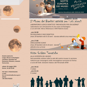 Nel corso della gionata dalle ore 16:30, il Museo archeologico lametino ha programmato un’offerta culturale dedicata al più ampio pubblico, dai piccoli fruitori agli adulti. Due i momenti, uno nelle ore preserali dalle 16:30 alle 18:30 dedicato al pubblico più piccolo con un laboratorio ludico-didattico e uno che si svolgerà dalle 19:15 sino alle 22:00 dedicato al pubblico adulto attraverso visite guidate tematiche che garantiranno la visita a tutte le sale del museo in versione notturna per immergersi nelle meravigliose narrazioni di Terina e della piana lametina.