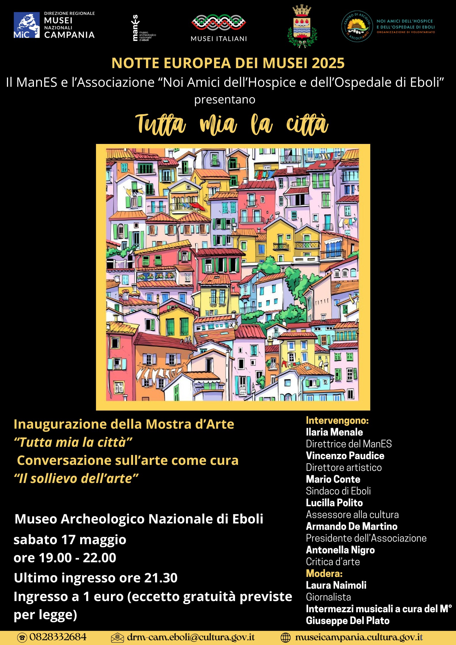 Per l’occasione, in collaborazione con l’Associazione “Noi Amici dell’Hospice e dell’Ospedale di Eboli”, sarà presentata ed inaugurata la mostra d’arte “Tutta mia la città”, a cura di Vincenzo Paudice, che raccoglie le opere realizzate nell’ambito del progetto “Tutta mia la città 2024” da diversi artisti che hanno raccontato, ciascuno con la propria sensibilità, l’identità culturale della città di Eboli e del suo territorio.