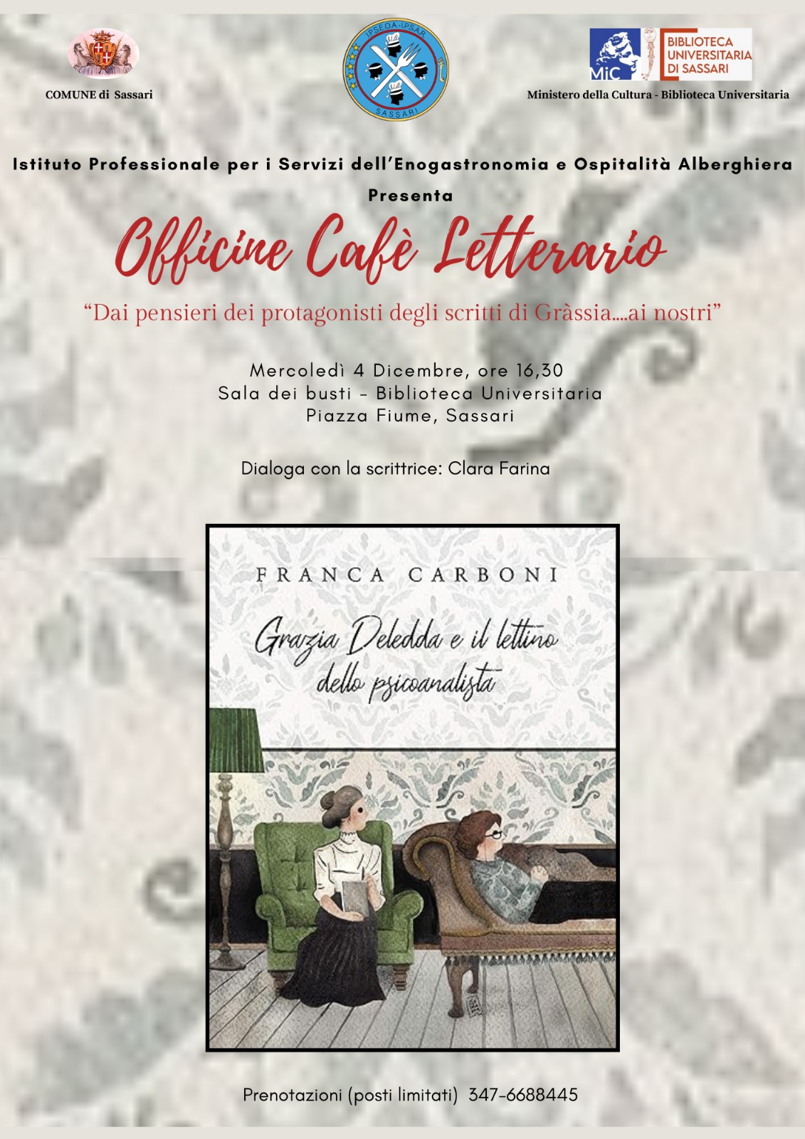 Il 4 dicembre, dalle 16:30, la Biblioteca Universitaria di Sassari, ospiterà, nella sua prestigiosa sede del complesso monumentale dell’Ex Ospedale Civile, in via Enrico Costa 57, la terza edizione di Officine cafè letterario, progetto promosso dall’IPSAR- IPSEOA - Istituto Professionale per i Servizi dell’Enogastronomia e dell’Ospitalità Alberghiera, nell’ambito della sua offerta formativa.