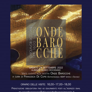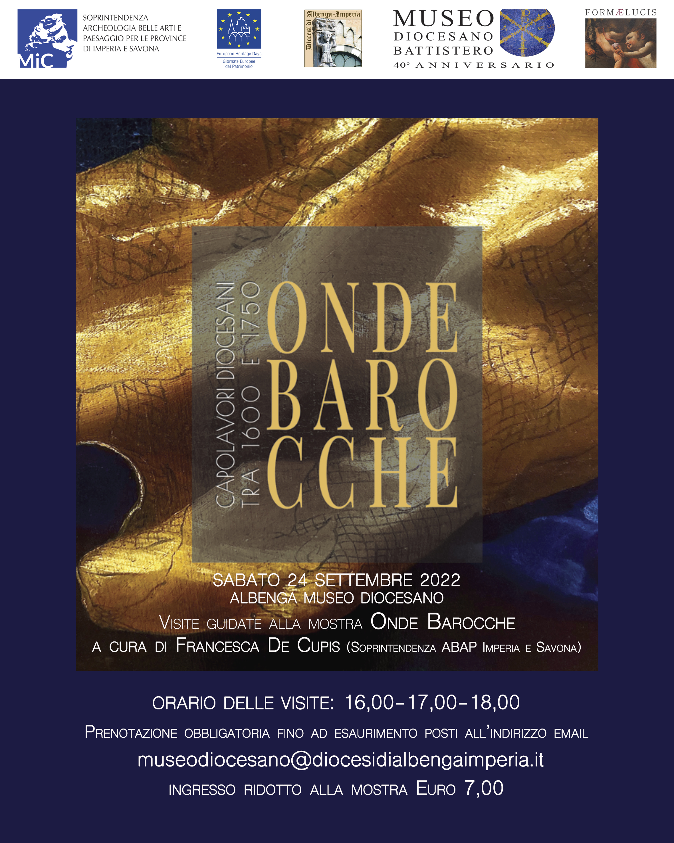 Sono previste n. 3 visite guidate scaglionate ( ore 16,00/ 17,00/ 18,00) alla mostra in corso presso il Museo Diocesano di Albenga dal titolo “Onde barocche. Capolavori diocesani tra 1600-1750” .