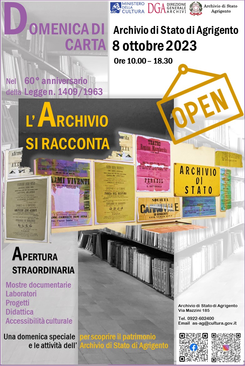 L’Archivio di Stato di Agrigento partecipa alla Domenica di Carta 2023 con l’evento dal titolo “Open. L’Archivio si racconta”.