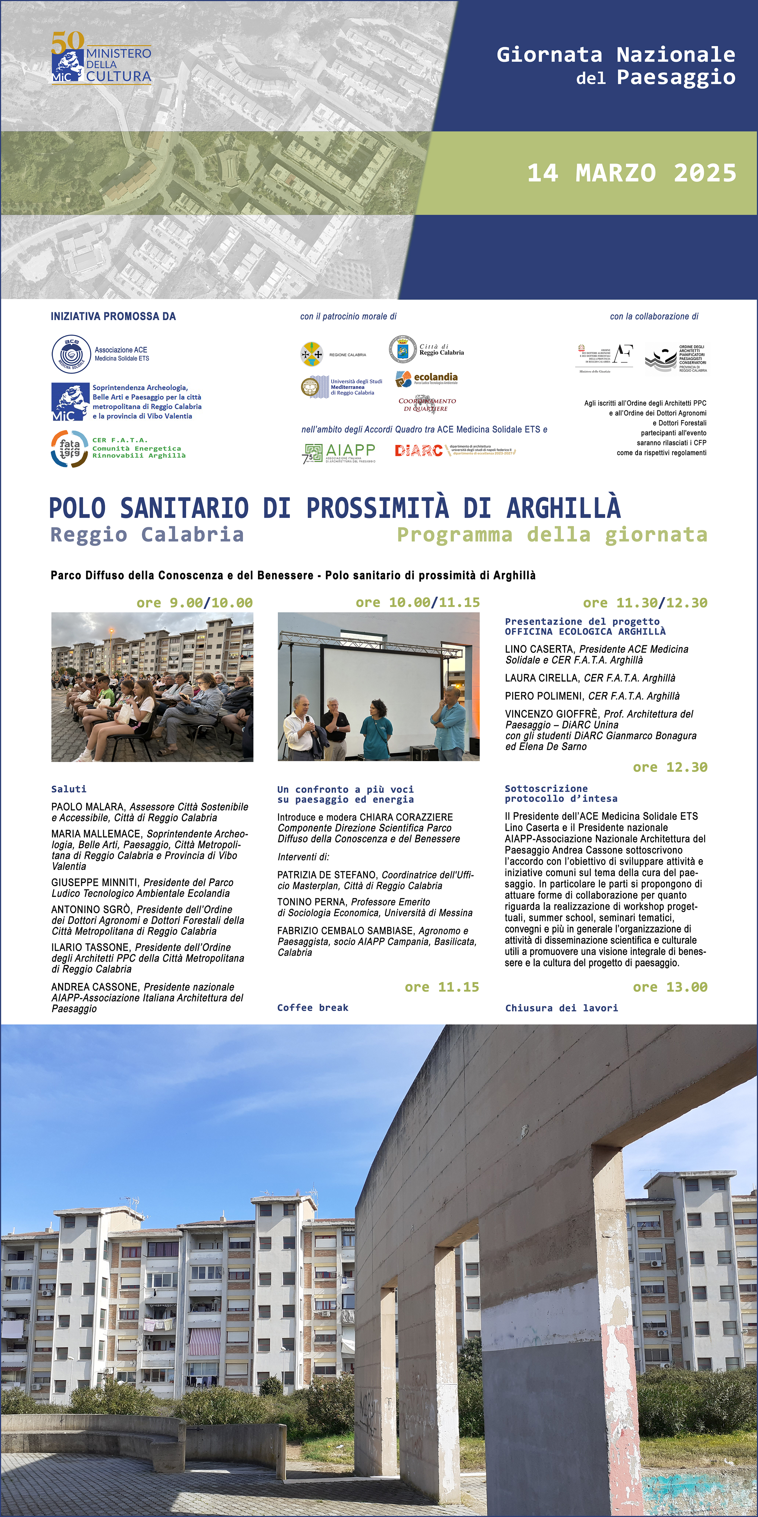 Nell’ambito del tema “Paesaggio ed Energia”, la Soprintendenza Archeologia, Belle Arti e Paesaggio per la Città Metropolitana di Reggio Calabria e la provincia di Vibo Valentia, con l’Associazione ACE - Medicina Solidale ETS di Pellaro e la Comunità Energetica Rinnovabili CER F.A.T.A., promuovono, anche quest’anno, un evento culturale condiviso con la comunità.