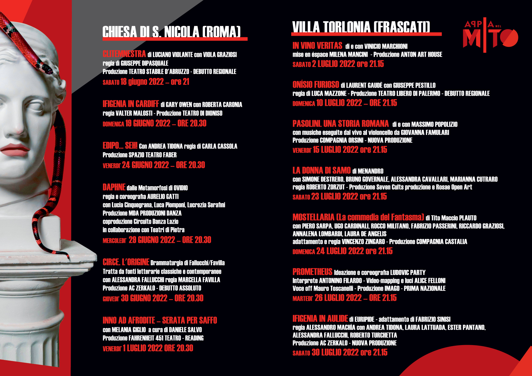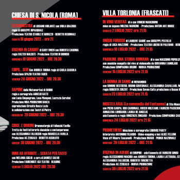 Il progetto completo coinvolge grandi artisti e giovani compagnie, dal 18 giugno al 30 luglio, in diverse location immerse nella storia e nel verde, tra Roma (Chiesa di San Nicola) e Frascati (Villa Torlonia, Villa Sciarra), con spettacoli di teatro e danza, reading, laboratori gratuiti di teatro, danza e giocoleria.