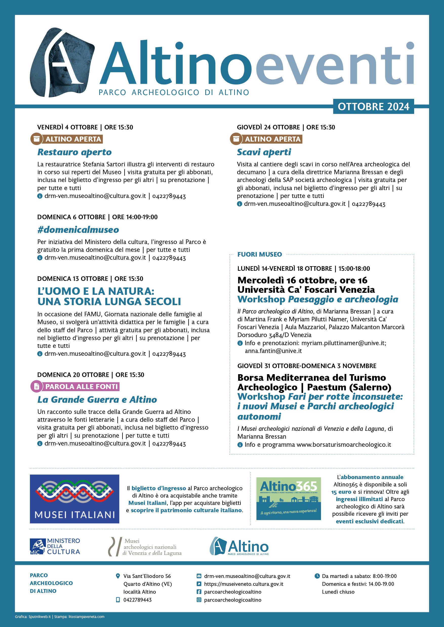 • mercoledì 16 ottobre, alle 16:00, Il Parco archeologico di Altino, intervento a cura di Marianna Bressan, durante il Workshop “Paesaggio e Archeologia”, a cura di Martina Frank e Myriam Pilutti Namer;