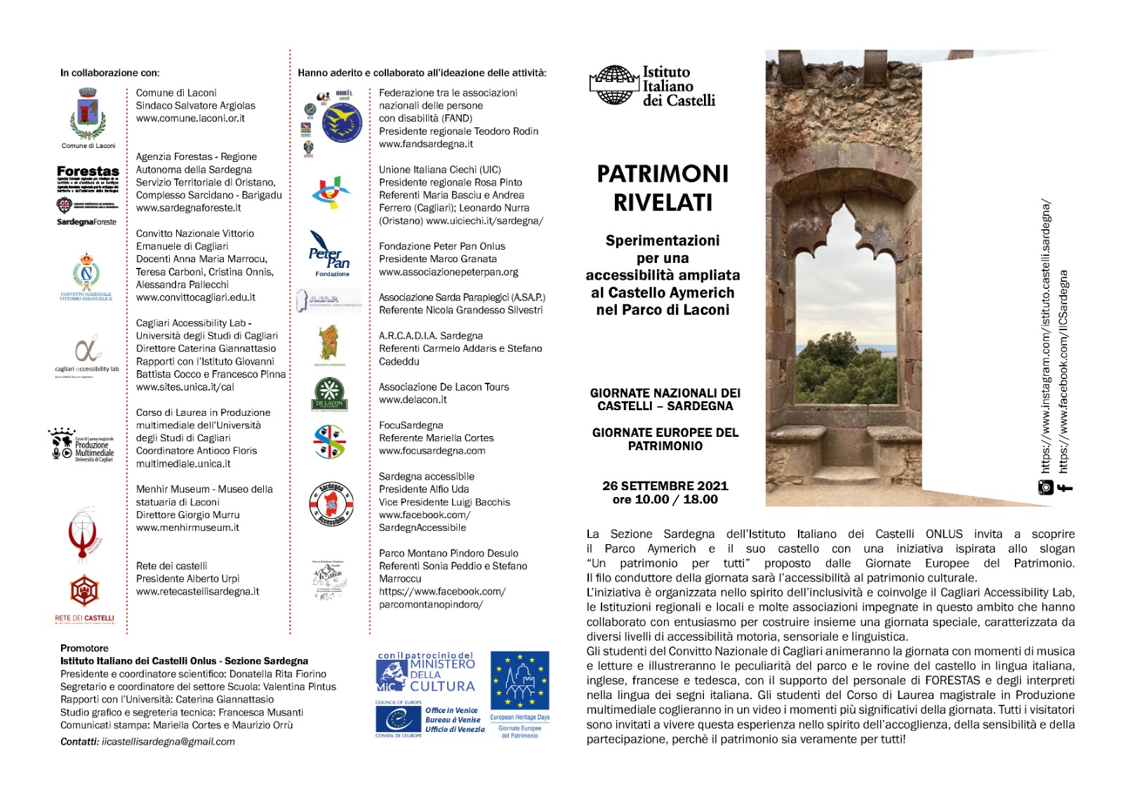 La Sardegna invita a scoprire uno dei borghi più belli d’Italia, Laconi, situato nel cuore della regione a ridosso della Barbagia con il Parco Aymerich dove alle rare essenze arboree e un eccezionale percorso guidato storico-paesaggistico si affiancherà la scoperta del castello omonimo che risale al XI secolo. Nella giornata del 26 settembre sono in programma diverse iniziative di carattere scientifico, divulgativo e ricreativo, ispirate allo slogan "Un patrimonio per tutti" proposto dalle Giornate Europee del Patrimonio.