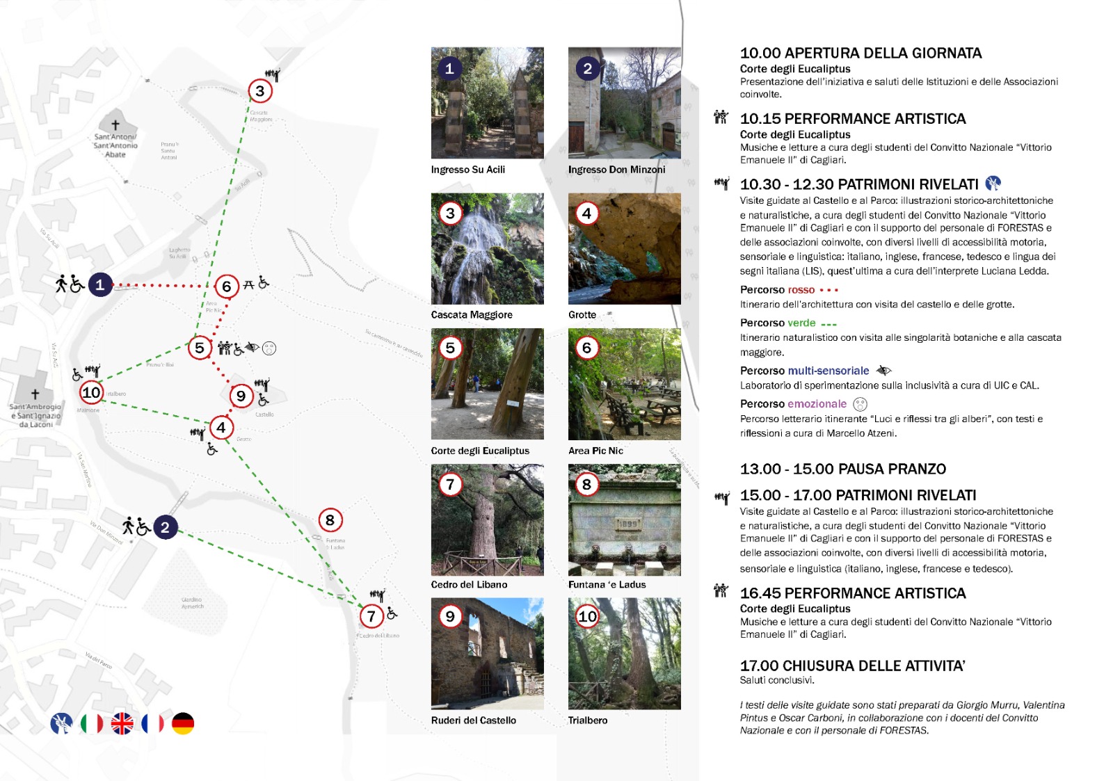 Il filo conduttore dell'intera giornata sarà, pertanto, il tema della accessibilità del patrimonio fortificato. L'iniziativa è organizzata nello spirito dell'inclusività e coinvolge istituzioni regionali e locali e molte associazioni già impegnate in questo ambito. Sul piano didattico e formativo, gli studenti del Convitto Nazionale di Cagliari, coinvolti nel PCTO, accompagneranno i visitatori alla scoperta del parco e del rudere del castello medievale, supportati da personale qualificato di Forestas, dell'Università degli Studi di Cagliari, del Museo Menhir e delle diverse associazioni coinvolte, per una visita che sia veramente ‘per tutti’! Il percorso potrà essere fruito con diversi livelli di comunicazione: oltre all'esposizione orale dei ragazzi, disponibile in lingua italiana, inglese e francese, saranno presenti interpreti nella lingua dei segni. Dettagli delle visite, orari e appuntamenti saranno consultabili nella pagina Facebook dell' istituto Italiano Castelli - sezione Sardegna.