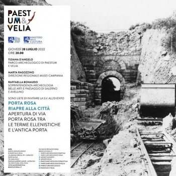 Giovedì 28 luglio 2022 alle ore 20:00 a Velia si terrà l’evento “Porta Rosa riapre alla città. Apertura di via Porta Rosa tra le Terme Ellenistiche e l’antica porta”, tratto chiuso a seguito dell’incendio del 2017 e riaperto grazie all’impegno e alla collaborazione tra il Parco Archeologico di Paestum e Velia, la Direzione regionale Musei Campania, la Soprintendenza Archeologia Belle Arti e Paesaggio di Salerno e Avellino e il Segretariato Regionale della Campania