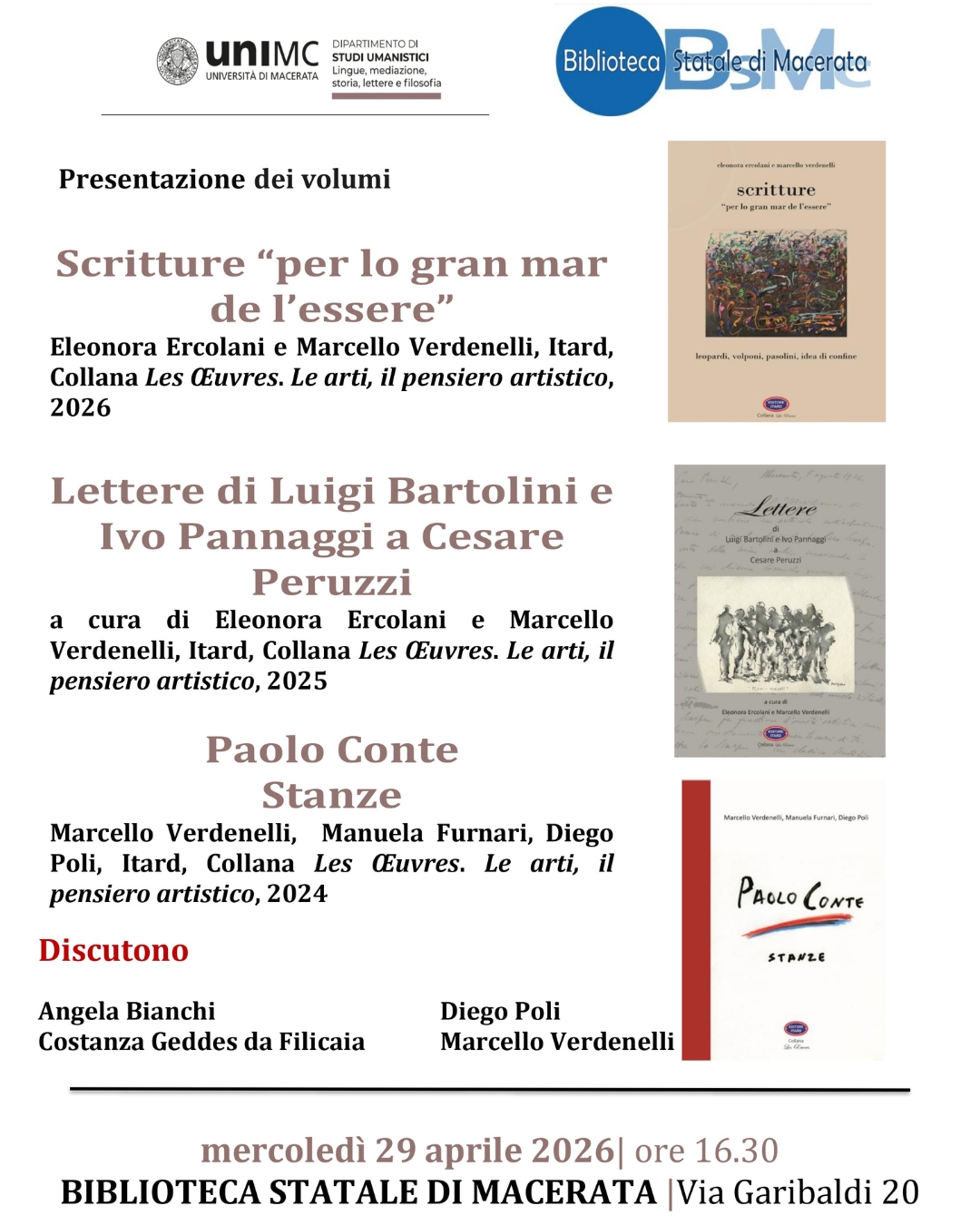 La Biblioteca Statale di Macerata in collaborazione con il Dipartimento di Studi Umanistici dell’Università degli Studi di Macerata mercoledì 29 aprile 2026 alle ore 16.30 organizza la presentazione dei volumi: Scritture “per lo gran mar de l’essere” di Eleonora Ercolani e Marcello Verdenelli; Lettere di Luigi Bartolini e Ivo Pannaggi a Cesare Peruzzi a cura di Eleonora Ercolani e Marcello Verdenelli; Paolo Conte Stanze di Marcello Verdenelli, Manuela Furnari e Diego Poli.