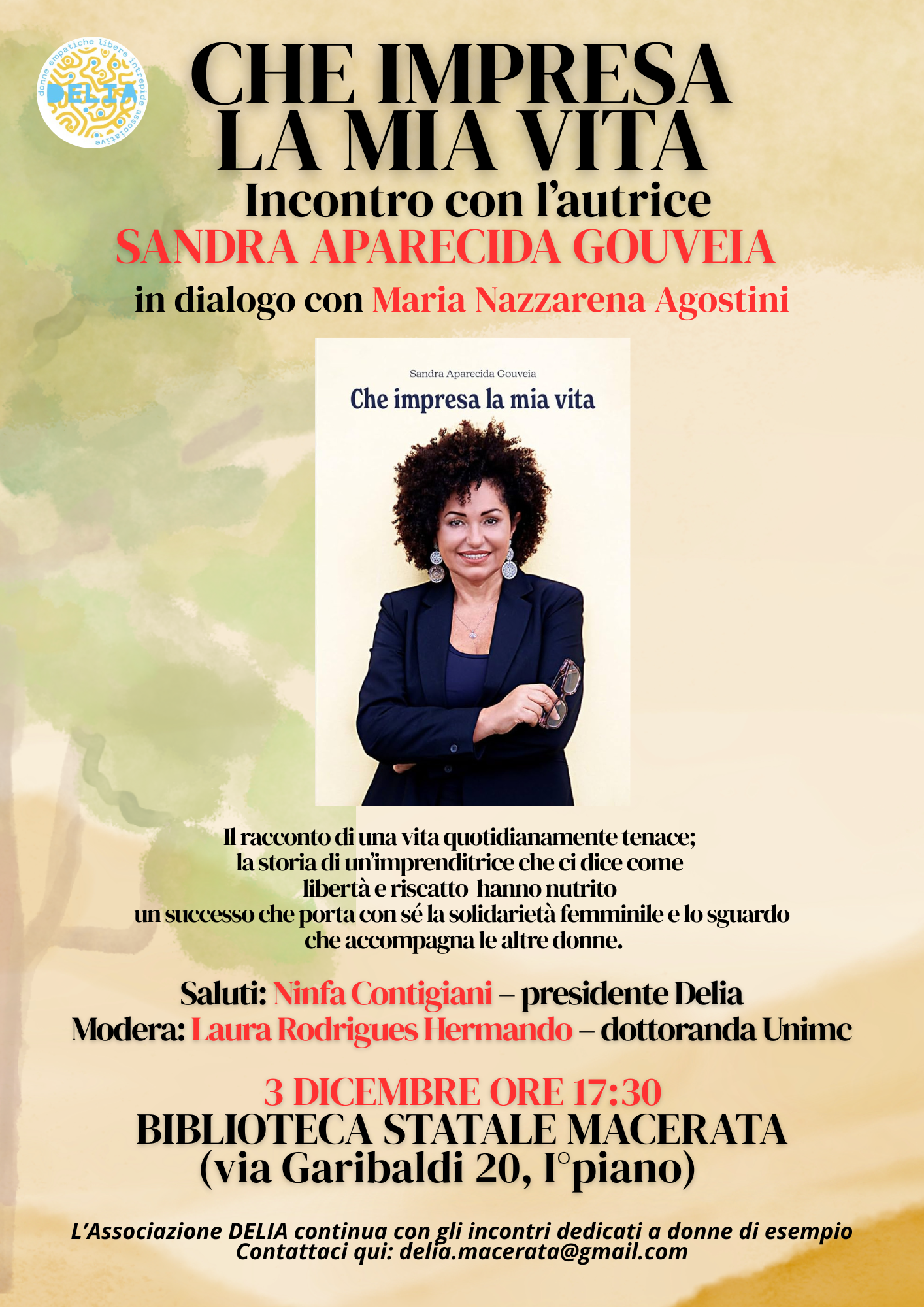Mercoledì 3 dicembre 2025 alle ore 17.30 presso la Biblioteca Statale di Macerata si terrà la presentazione del libro di Sandra Aparecida Gouveia: “Che impresa la mia vita”.