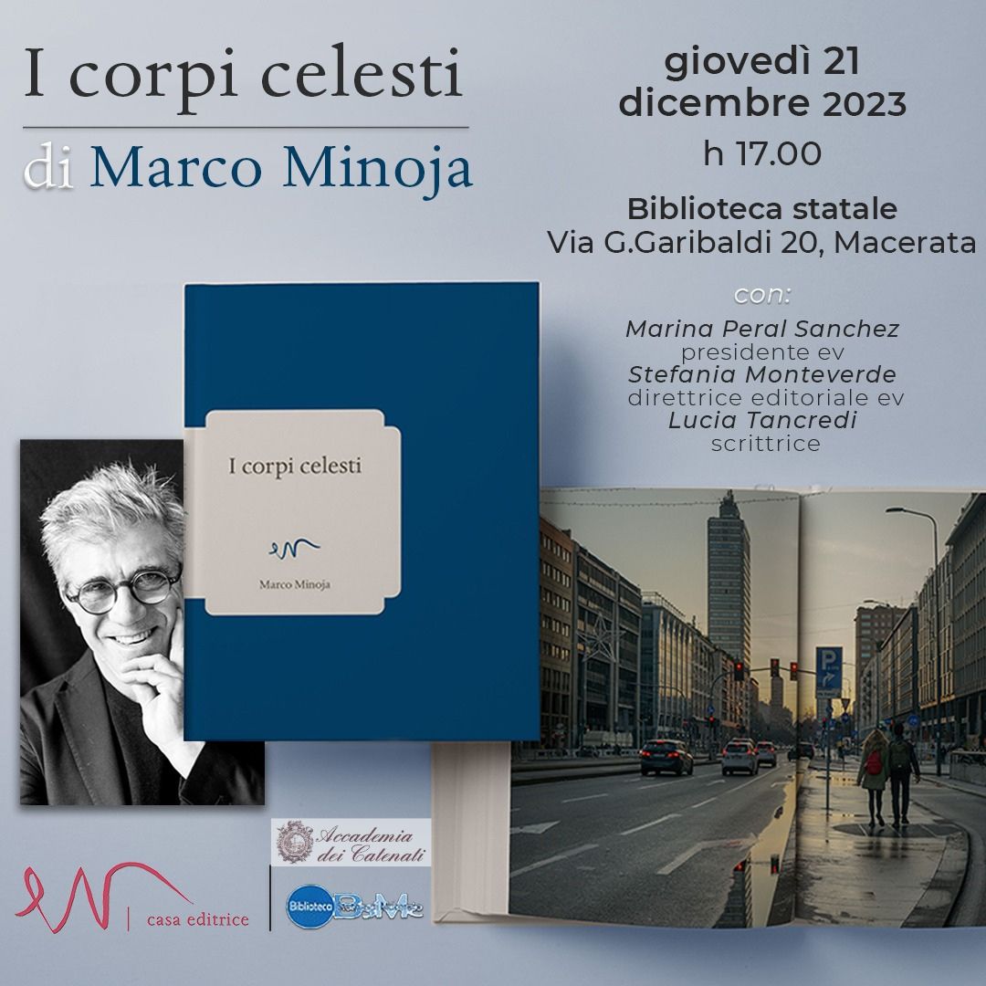 La Biblioteca Statale di Macerata in collaborazione con l’Accademia dei Catenati di Macerata ed ev casa editrice, giovedì 21 dicembre 2023 alle ore 17, organizza la presentazione del libro di Marco Minoja: “I CORPI CELESTI”. Interverranno: Marina Peral Sanchez – presidente ev, Stefania Monteverde – direttrice editoriale ev e Lucia Tancredi - scrittrice.