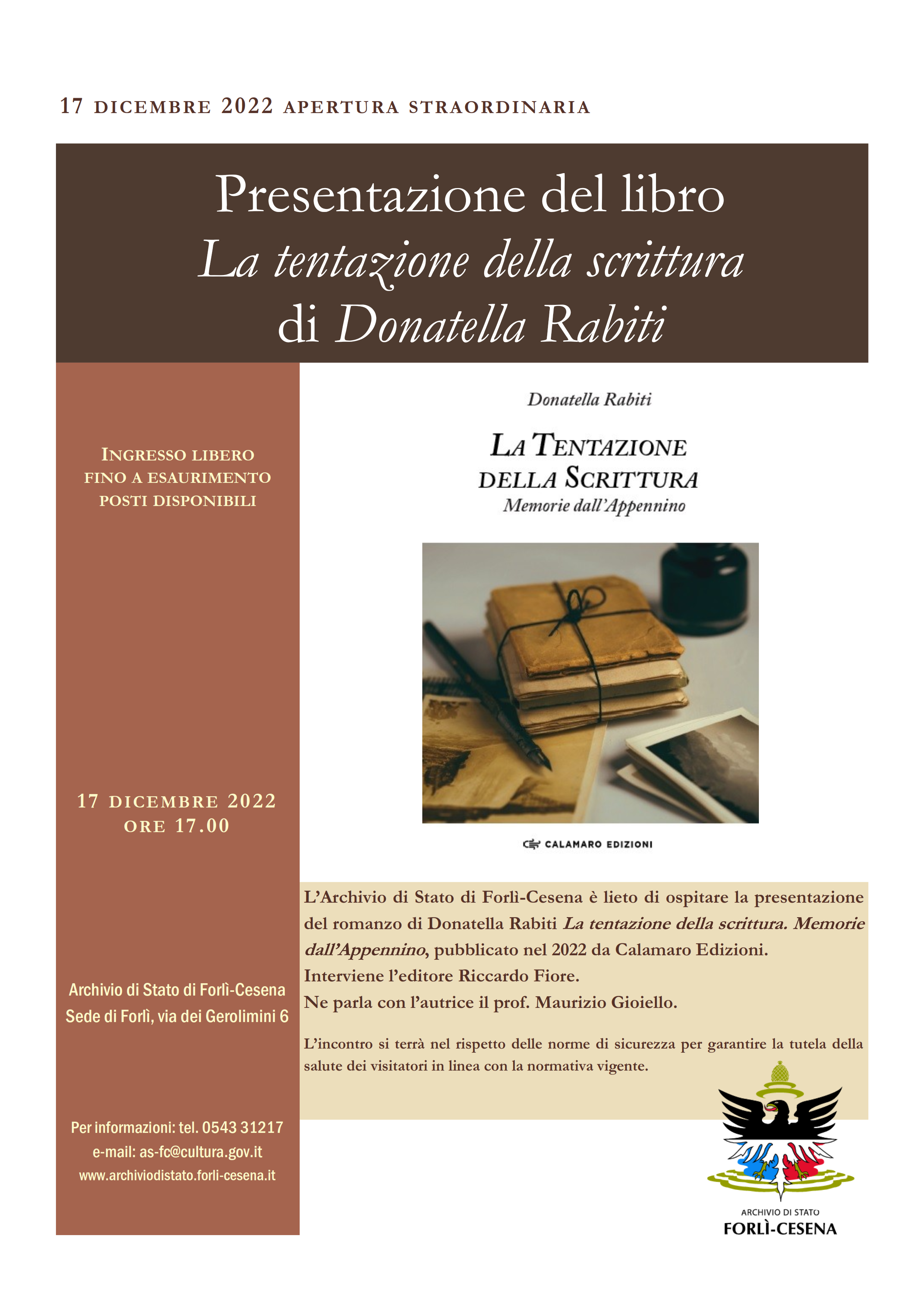 Sabato 17 dicembre 2022 alle ore 17.00, nell'ambito del piano di valorizzazione promosso dal Ministero della Cultura, l'Archivio di Stato di Forlì-Cesena è lieto di ospitare la presentazione del romanzo di Donatella Rabiti La tentazione della scrittura. Memorie dall'Appennino, pubblicato nel 2022 da Calamaro Edizioni.