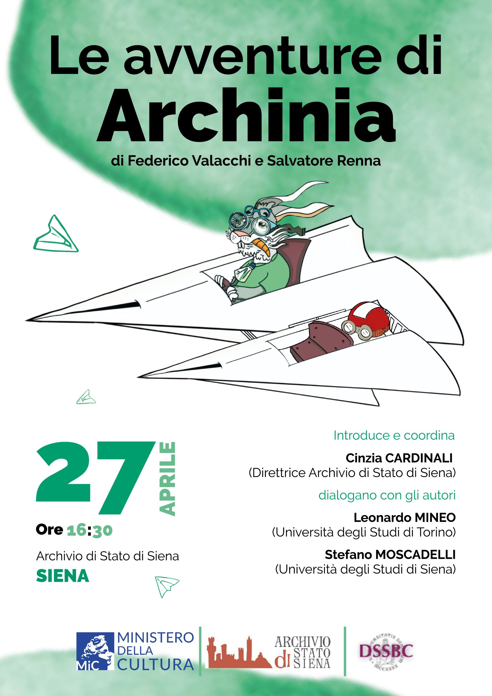 A Siena, mercoledì 27 aprile, alle ore 16,30, presso la sede dell’Archivio di Stato (via Banchi di Sotto, 52), viene presentata la graphic novel Le avventure di Archinia di Federico Valacchi e Salvatore Renna (Editrice Bibliografica, 2021).