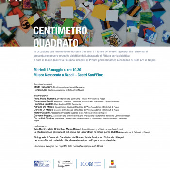 Martedì 18 maggio 2021, a partire dalle 10.30, in occasione dell'International Museum Day, la Giornata internazionale dei Musei istituita dall’ICOM - International Council of Museums, l’Accademia di Belle Arti di Napoli presenterà Centimetro Quadrato, un’opera-progetto realizzata dagli allievi del corso di Laboratorio di Pittura per la didattica, a cura del docente Mauro Maurizio Palumbo, che sarà esposta nella chiesa di Sant’Erasmo, sulla piazza d'armi di Castel Sant'Elmo a Napoli.