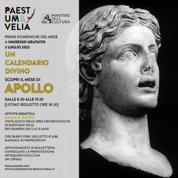 Per questa prima domenica del mese, bambini e ragazzi dai 5 ai 13 anni possono partecipare a una caccia a tesoro, sia a Paestum sia a Velia. Si tratta di una visita- gioco della durata di 90 minuti che farà scoprire ai giovani visitatori i segreti delle antiche città di Poseidonia ed Elea.