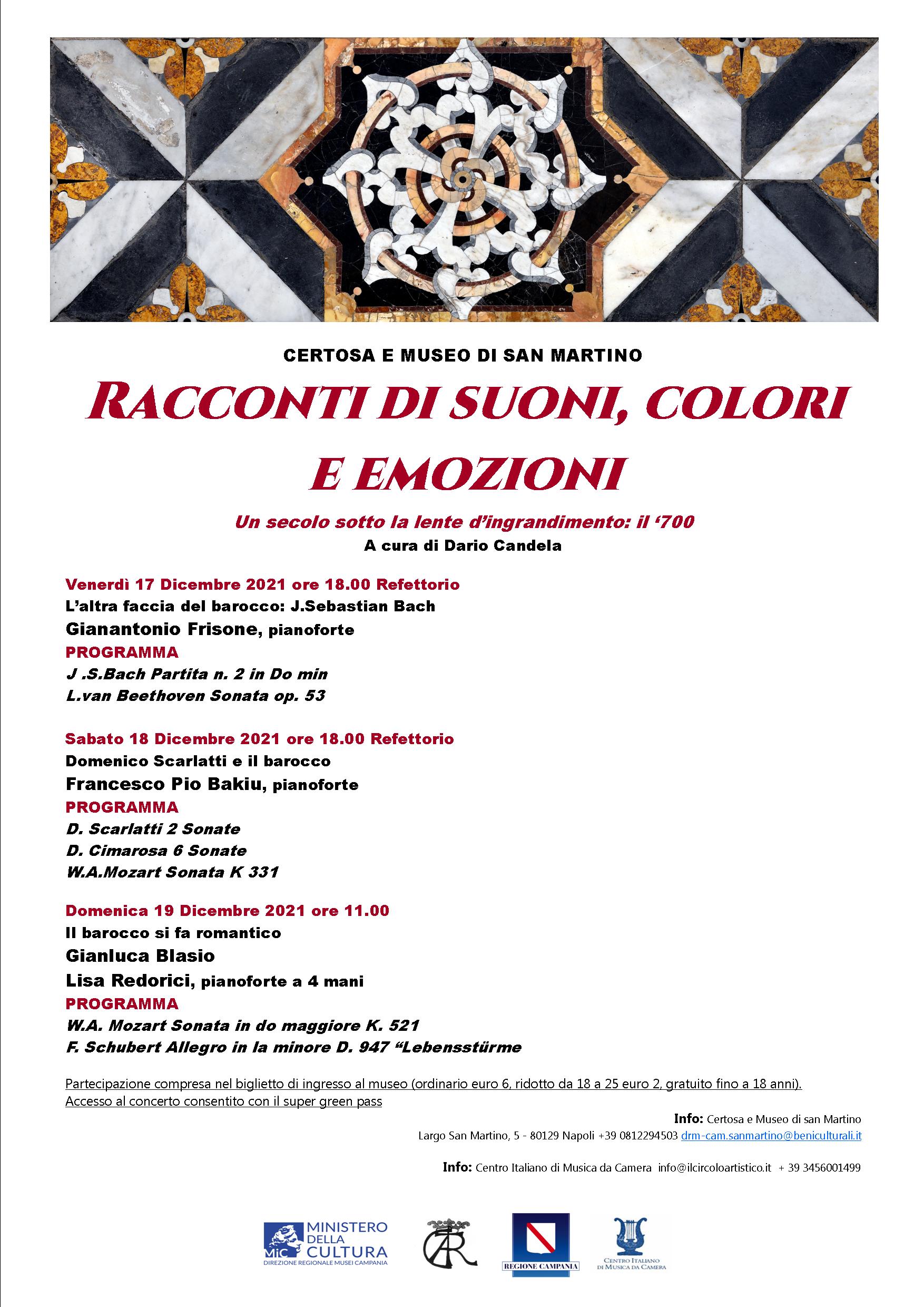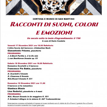 Venerdì 17 dicembre 2021 alla Certosa e Museo di San Martino prende il via la rassegna musicale per solo piano “Racconti di suoni, colori e emozioni. Un secolo sotto la lente di ingrandimento: il ‘700 ”, nata dalla collaborazione tra la Direzione regionale Musei Campania e il Centro Italiano di musica da Camera.