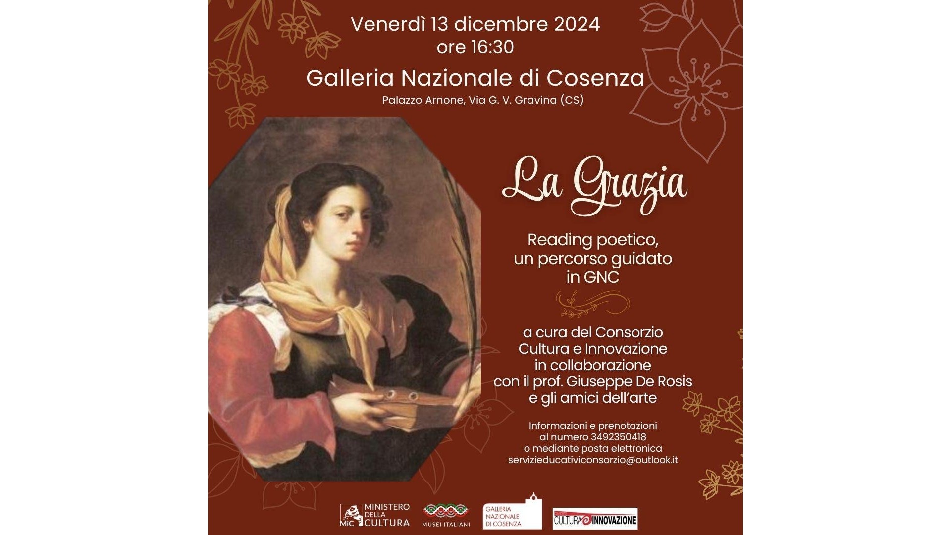 Nel giorno in cui si festeggia Santa Lucia, la "fanciulla che portava luce in mezzo alle tenebre", venerdì 13 dicembre 2024, ore 16:30, si svolgerà a Palazzo Arnone il reading poetico "La Grazia", un percorso guidato nella Galleria nazionale di Cosenza,