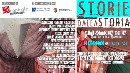 La Centrale dell’Arte presenta sabato 14 agosto lo spettacolo “Storie dalla Storia - MITI sotto la tenda”, nato da un progetto in collaborazione con la Direzione regionale musei della Toscana – Museo archeologico nazionale di Cosa. Oltre alla finzione teatrale e alla messa in scena delle storie e dei miti dell’antichità, i partecipanti saranno stimolati e sollecitati dalla narratrice a raccontare, interpretare in prima persona e a far proprie le leggende narrate, attraverso la fantasia e le proprie emozioni.