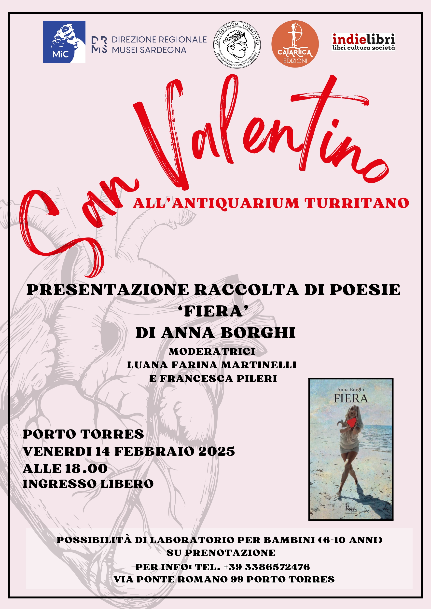 Venerdì 14 febbraio, alle 18.00, presso l’Antiquarium Turritano di Porto Torres, in occasione del San Valentino 2025, si terrà la presentazione della raccolta di poesie “Fiera” di Anna Borghi, edita da Catartica Edizioni.