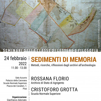 Nell’ambito dei Seminari della Classe di Lettere e Filosofia della Scuola Normale Superiore, il seminario dal titolo Sedimenti di memoria. Metodi, ricerche, riflessioni dagli archivi all’archeologia, rappresenta un importante momento di riflessione sui progetti che riguardano gli archivi e l’archeologia e sul dialogo costruttivo tra ambiti disciplinari differenti. In occasione del seminario saranno presentati anche alcuni aspetti dei progetti archivistici dell’Archivio di Stato di Agrigento e delle ricerche, in corso, legate alla collaborazione tra l’Istituto di Agrigento e la Scuola Normale Superiore di Pisa, con riferimento al Progetto Agrigento, diretto dal Prof. Gianfranco Adornato, per gli Studi archeologici 2022 del SAET - Laboratorio di Storia, Archeologia, Epigrafia e Tradizione dell'Antico.
