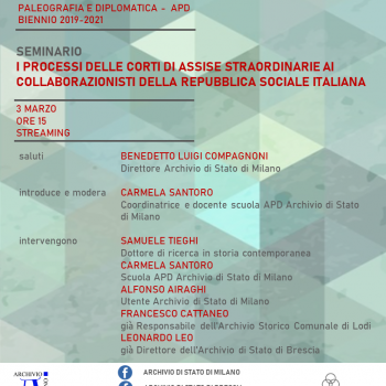 Mercoledì 3 marzo, alle ore 15, nell’ambito de “Le conferenze del mercoledì” della Scuola di Archivistica Paleografia e Diplomatica dell'Archivio di Stato di Milano si terrà il seminario “I processi delle Corti di Assise straordinarie ai collaborazionisti della Repubblica Sociale Italiana” in modalità live streaming.