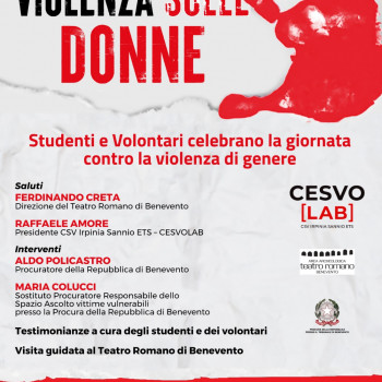 L'Area Archeologica del Teatro Romano di Benevento, in collaborazione con la Procura della Repubblica di Benevento e il CESVOB, Centro Servizi per il Volontariato di Benevento, nel quadro delle iniziative previste a livello territoriale, organizza venerdì 25 novembre alle ore 10.00 un incontro, rivolto soprattutto al mondo della scuola, per creare maggiore consapevolezza sui comportamenti e gli atteggiamenti violenti che connotano la “cultura della sopraffazione”, attraverso un’azione di prevenzione che, con la scuola, vuole promuovere una cultura della non-violenza, aiutando i ragazzi e le ragazze a gestire i conflitti relazionali.