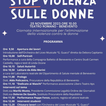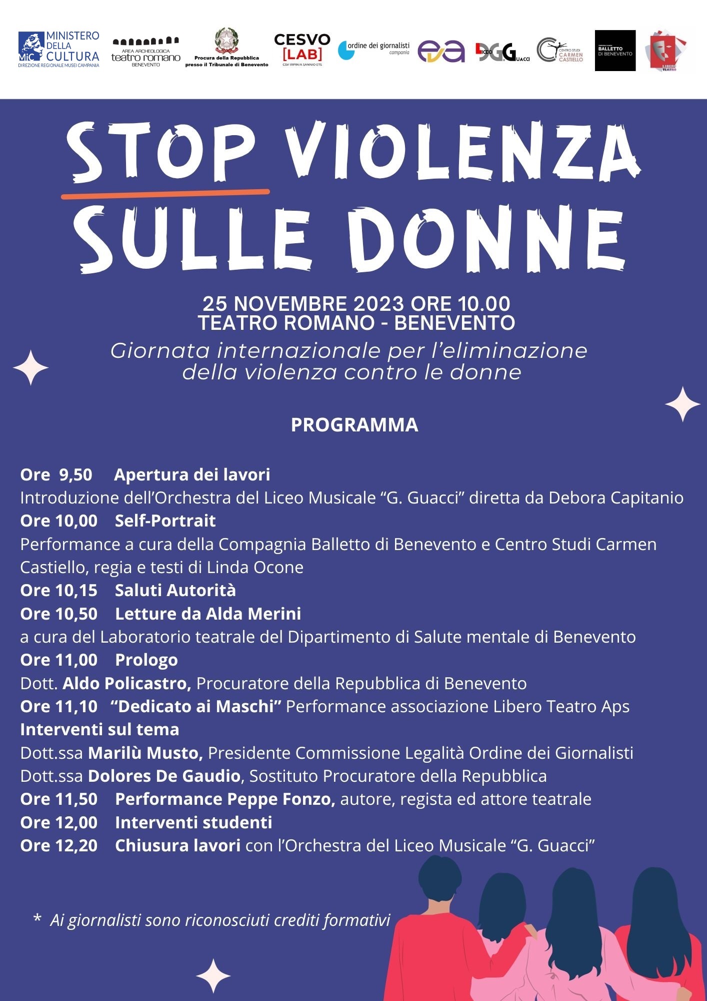L'Area Archeologica del Teatro Romano di Benevento, in collaborazione con la Procura della Repubblica di Benevento, il CESVOB - Centro Servizi per il Volontariato di Benevento, l’Ordine dei Giornalisti della Campania, la Cooperativa E.V.A., gli Istituti Scolastici, le associazioni del mondo dello spettacolo, nel quadro delle iniziative previste a livello territoriale propone venerdì 25 novembre alle 9.50 un incontro celebrativo con la presenza delle massime autorità provinciali.