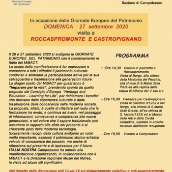 Visite ad alcuni punti di interesse della storia e del paesaggio della valle del Biferno. 14h30 a Roccaspromonte la Madonna del Peschio, la chiesa di Santa Maria della Pietà e la copia della statua di Minerva il cui originale ( V sec. a.C.) si trova al Kunsthistorisches Museum di Vienna; 16h00 a Castopignano il Castello D' Evoli, il centro storico e il Museo Etnografico della civilità contadina.