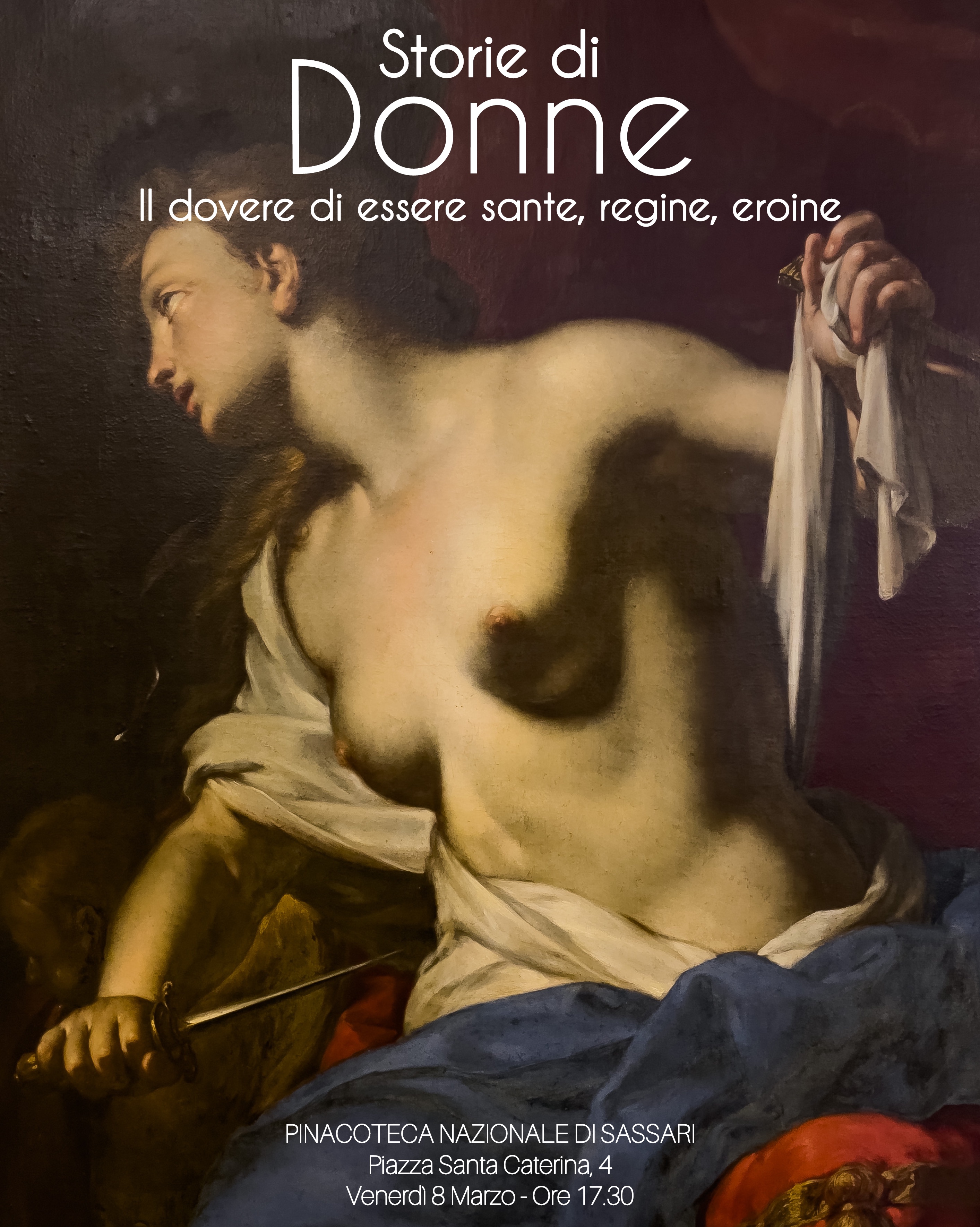Venerdì 8 marzo, in occasione della Giornata Internazionale della Donna, la Pinacoteca Nazionale di Sassari presenta Storie di Donne. Il dovere di essere sante, regine, eroine, riflessione sulle donne ritratte e sulla loro esistenza, forzatamente eroica e tragica: racconti di regine, sante, donne comuni e leggendarie. Costrette a essere ‘speciali’ quasi sempre a seguito di un episodio di violenza, o comunque di una costrizione.