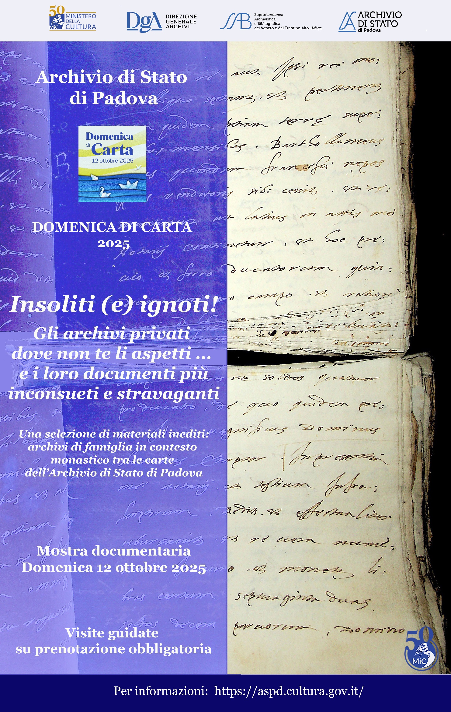 L’Archivio di Stato di Padova presenta l’esposizione documentaria Strane carte di famiglia negli archivi dei monasteri padovani che si terrà domenica 12 ottobre 2025 in occasione della Domenica di Carta, importante evento di valorizzazione del patrimonio documentario conservato, realizzato nell’ambito del Piano di valorizzazione del Ministero della cultura, sempre più partecipato dal pubblico.