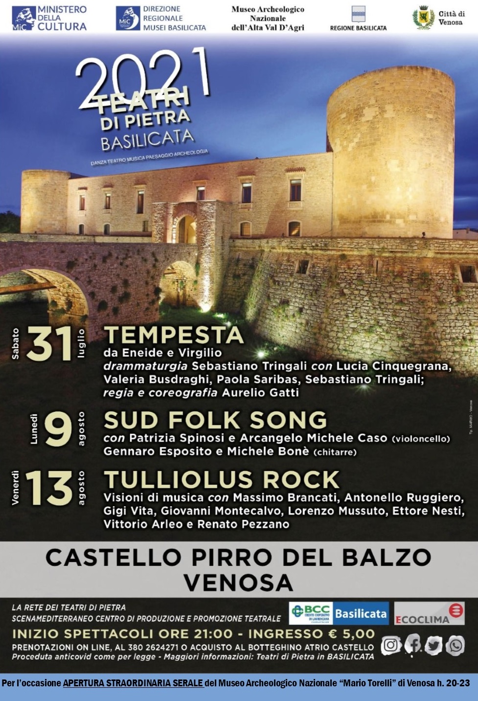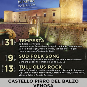 Sabato 31 luglio, nell’incantevole cornice del Castello Pirro del Balzo di Venosa, torna il Festival “Teatri di Pietra. Danza Teatro Musica Paesaggio Archeologia”. La manifestazione, finanziata dal Ministero della Cultura, ha come obiettivo la valorizzazione di importanti siti storico-archeologici attraverso lo spettacolo dal vivo. Per l’occasione è prevista dalle h. 20 alle h. 23 l’apertura straordinaria serale del Museo Archeologico Nazionale “Mario Torelli”, ospitato nel camminamento seminterrato del Castello.