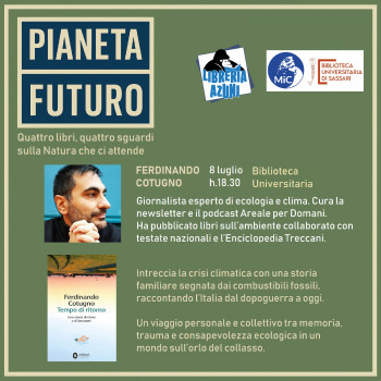 Presentazione del libro “Tempo di ritorno. Una storia di clima e di fantasmi” di Ferdinando Cotugno, edito da Guanda. La serata verrà aperta dai saluti del direttore della Biblioteca Universitaria di Sassari, dott. Giovanni Fiori che introdurrà l'autore, il giornalista climatico Ferdinando Cotugno.