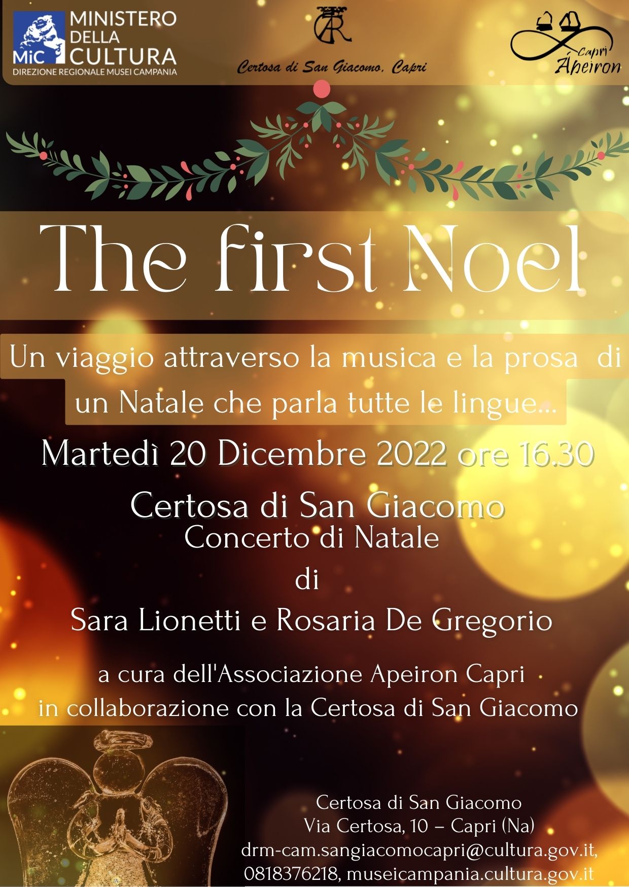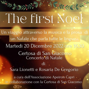 “THE FIRST NOEL - Un viaggio attraverso la musica e la prosa di un Natale che parla tutte le lingue...” è il titolo dell’evento dedicato alla tradizione natalizia, che avrà luogo nella chiesa della Certosa di San Giacomo, Capri, martedì 20 dicembre alle 16.30.