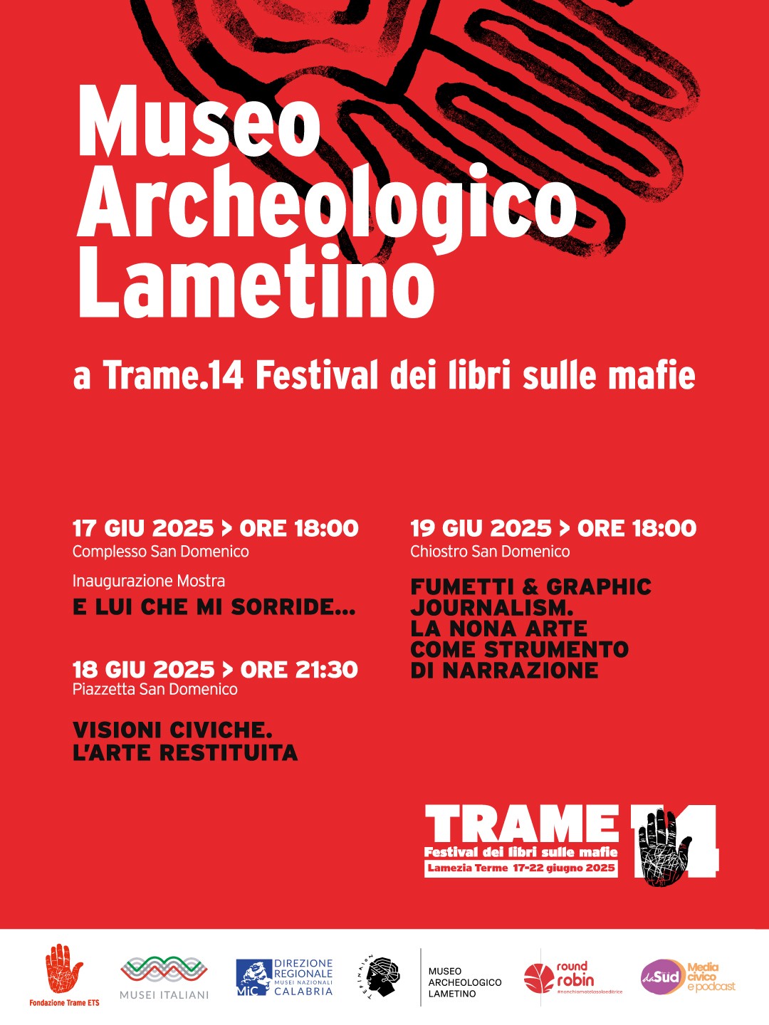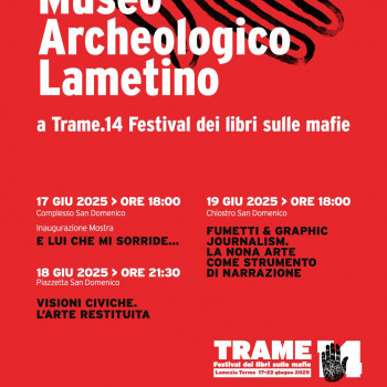 Per Trame.14 è in programma la mostra di fumetti “E lui che mi sorride…”, omaggio a Giancarlo Siani, giornalista vittima innocente della camorra, ospitata presso il Museo archeologico lametino fino al 28 settembre 2025. Attraverso il linguaggio del graphic journalism il progetto narra l’impegno civile di artisti, reporter e cronisti che, con il proprio sguardo libero e coraggioso, hanno svelato verità scomode e complesse. La presenza di tale progetto espositivo in un museo nazionale si inserisce nel solco, già tracciato dal Ministero della Cultura, volto ad aprire un dialogo tra spazi museali e pubblico attraverso il linguaggio della nona arte del fumetto. L’inaugurazione è prevista martedì 17 giugno, giornata inaugurale del Festival. Previsto per giovedì 19 anche un incontro di presentazione.