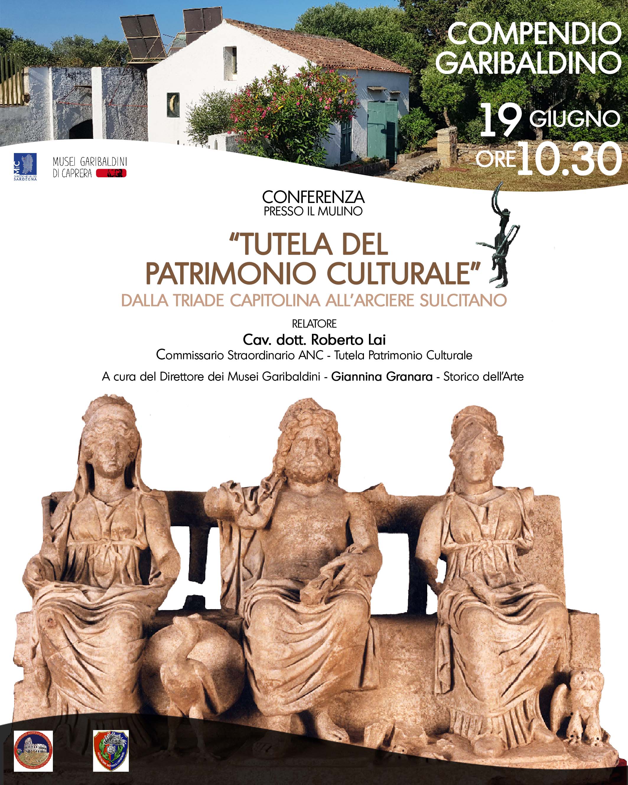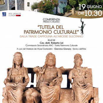 Il Compendio Garibaldino di Caprera ospiterà, alle 10.30, nel suggestivo spazio del Mulino della casa Bianca, l'interessante conferenza Tutela del Patrimonio Culturale. Dalla Triade Capitolina all'Arciere Sulcitano.