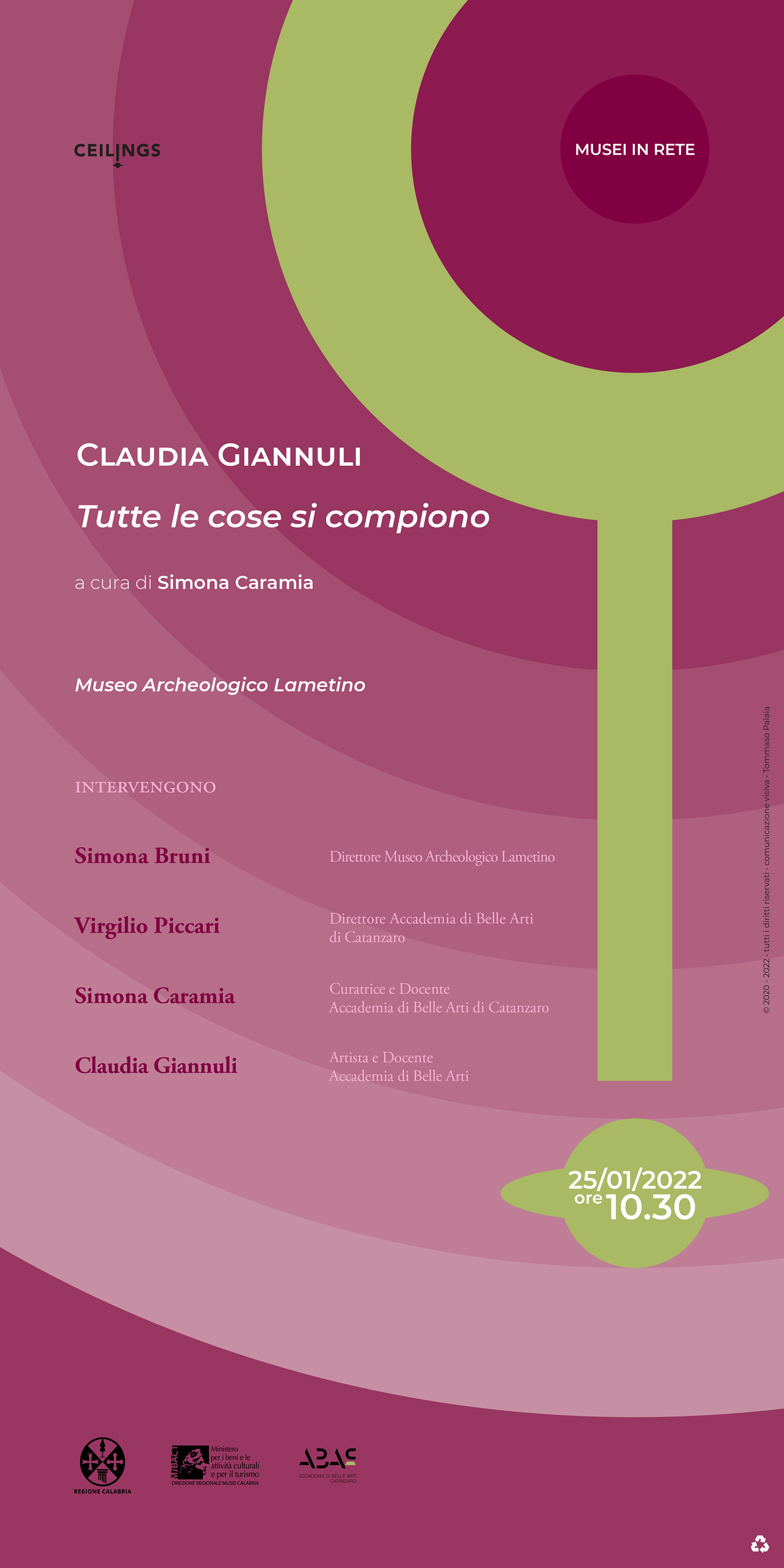 “Tutte le cose si compiono” di Claudia Giannuli chiude la terza edizione di Ceilings, il progetto dell’Accademia di Belle Arti di Catanzaro, cofinanziato dalla Regione Calabria con fondi PAC Calabria 2014-2020 e curato da Simona Caramia..
